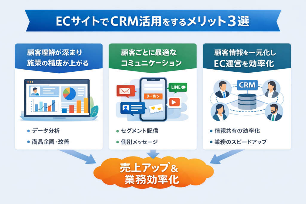 ECサイトでCRMを活用することで、売上面だけでなく、日々の運営やマーケティング全体にさまざまな効果が期待できます。