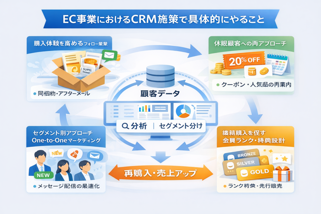 ここでは、多くのEC通販事業で再現性が高く、比較的取り組みやすいCRM施策を3つ紹介します。