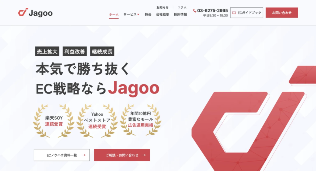 ジャグー株式会社は、Amazon・楽天・自社ECの運営支援に特化したEC代行会社です。商品ページ制作・広告運用・SEO対策に加え、物流・カスタマーサポート代行まで対応できる点が特徴です。小ロットの商材やニッチカテゴリーでの販売にも対応しており、立ち上げ期から成長期まで柔軟にプランを設計します。