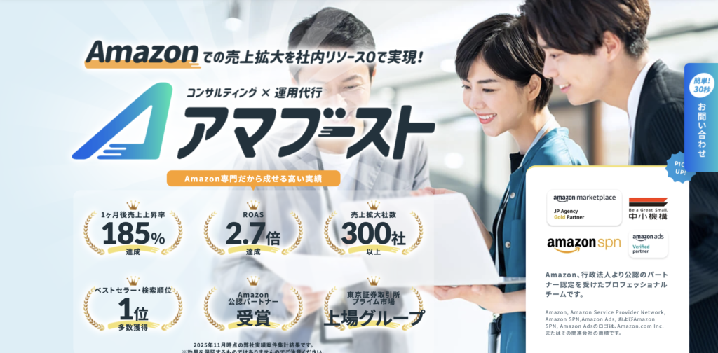 アマブーストは、Amazon専門に特化した月額制の広告運用代行サービスです。月額3万円〜という低価格プランから対応できる点が特徴で、スタートアップや中小企業でも手軽にAmazon広告代行を始められます。