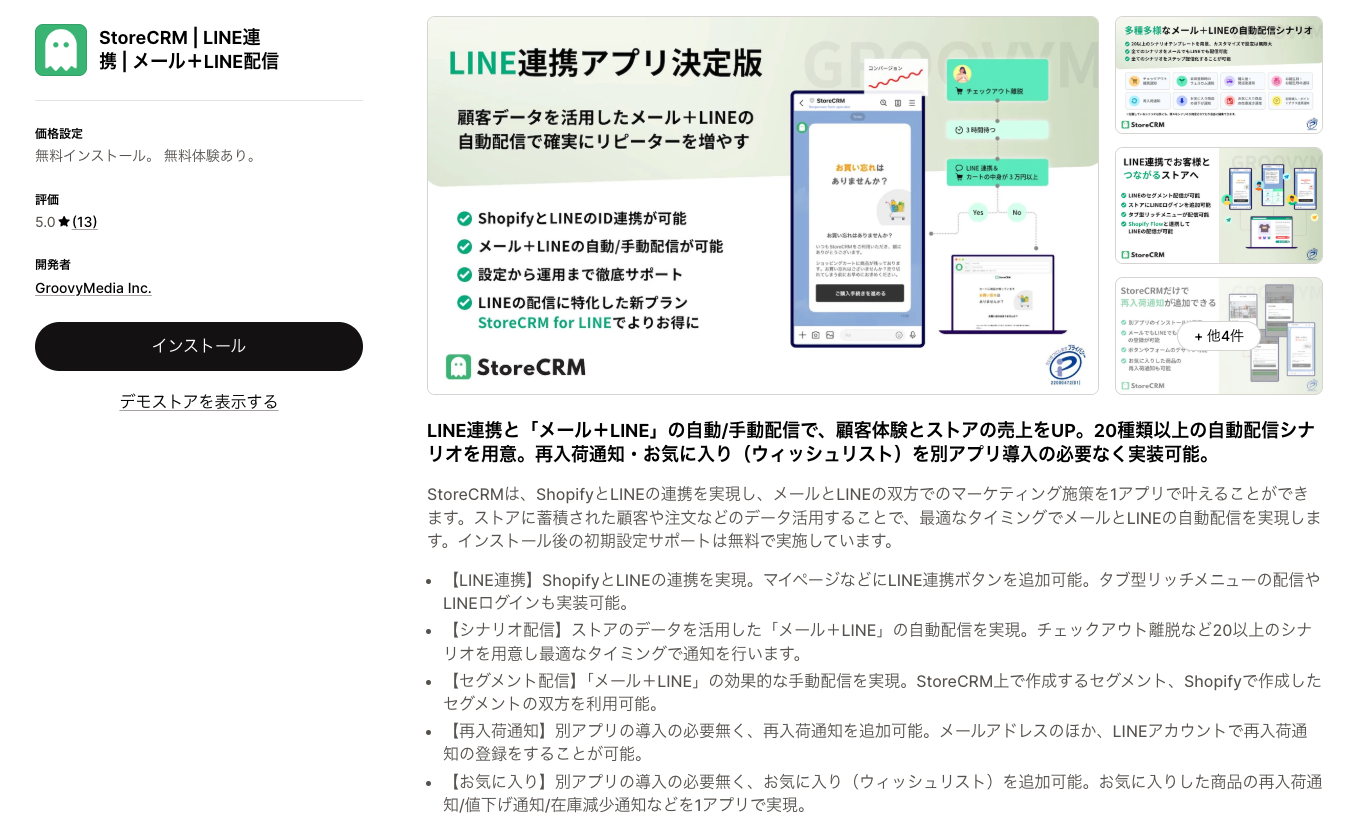 StoreCRMは、日本企業が開発したShopify向けCRM/MAアプリで、メール配信に加えてLINEの連携・配信にも対応するなど、日本のストア運用に適した豊富な機能を備えている点が特徴です。EC運用で活用しやすい多彩な自動配信シナリオ(配信フロー)を用意しており、顧客の購買・行動データをもとに、配信内容や配信タイミングを最適化しながら運用できます。さらに、顧客データを活用した高度なセグメント配信にも対応しているため、顧客ごとに最適なコミュニケーションを実現しやすく、リピート獲得や顧客エンゲージメントの向上に役立ちます。