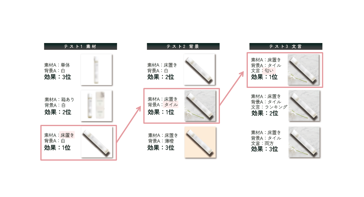 その点比較テスト(ABテスト)を利用することで、たとえば商品画像を良い結果が出た商品のように統一するなどの工夫をいれることで、他の商品でも良い結果が出る可能性が高くなります。