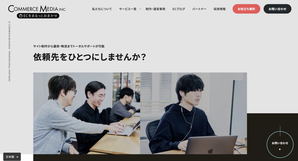 コマースメディア株式会社は、日本国内で3社目にShopify Experts認定を受けたShopify特化の支援会社です。制作から運営代行、物流、カスタマーサポートまでEC事業の全領域をカバーし、部分的なサポートからフルサポートまで柔軟に対応できる点が特徴です。自社でもShopifyを使ったEC事業を運営しているため、実践に裏打ちされたノウハウを持っています。