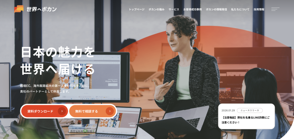世界へボカン株式会社は、越境EC・海外Webマーケティングに完全特化した支援会社です。英語圏を中心に多くの海外販売支援実績を持ち、Shopifyを使った多言語・多通貨対応のEC構築と、海外向けSEO・広告運用の知見が豊富です。国内販売は他社で行い、海外販売だけを世界へボカンに依頼するケースもあります。