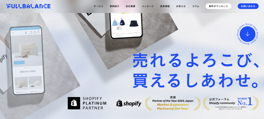 株式会社フルバランスは、Shopifyに特化したコンサルティング・運営支援を提供しています。Shopify公式フォーラムでの貢献度が高く、Shopifyの技術仕様に関する深い知見が強みです。売上成長率の具体的な数字を公開しており、成果にコミットした支援スタイルが特徴です。所在地は東京都千代田区。